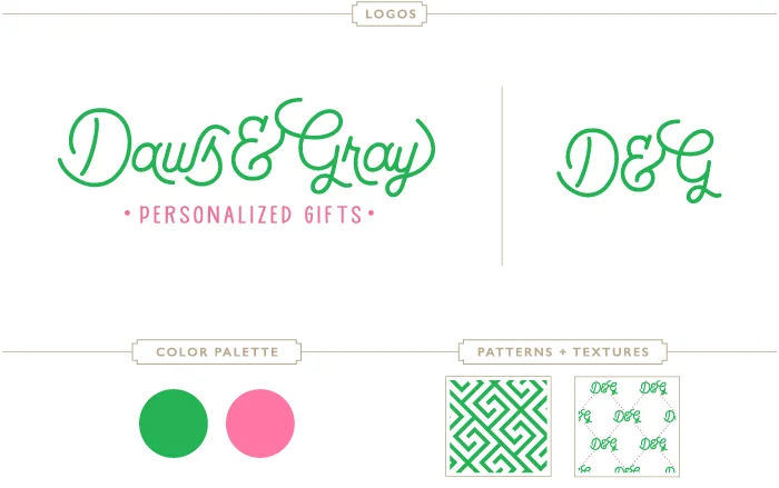 The client wanted a preppy, fun, yet sophisticated logo for her contemporary online boutique specializing in personalized gifts, Daws&Gray. I paired a geometric pattern and modern script with interlocking ampersand and "G" to create a unique and recognizable primary logo and monogram secondary mark.